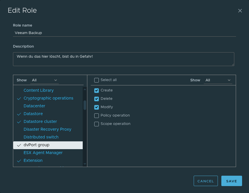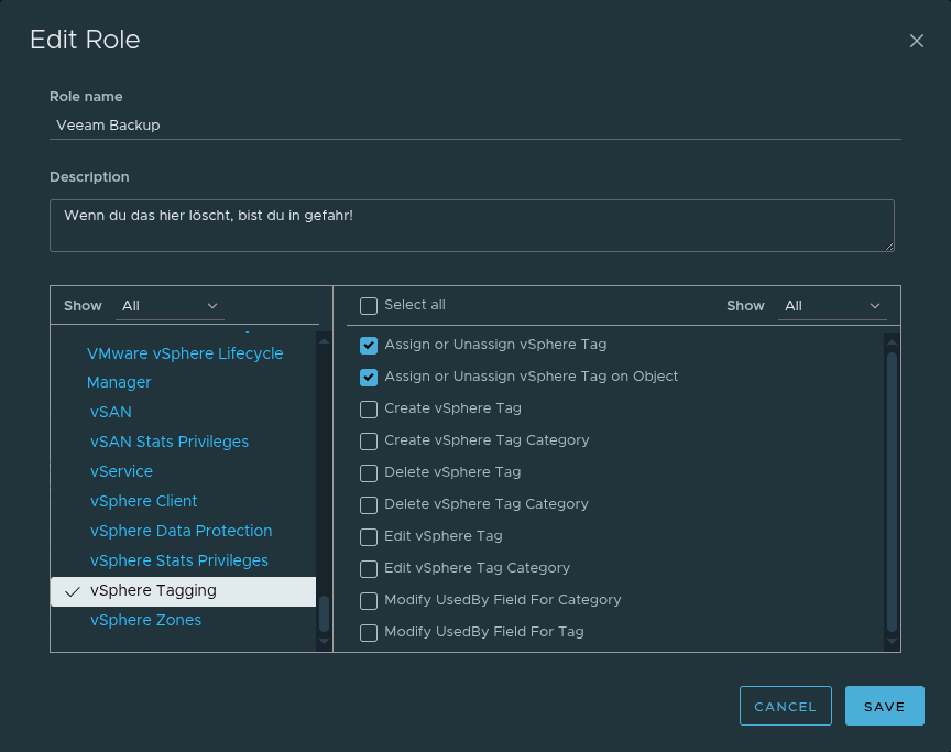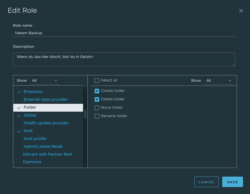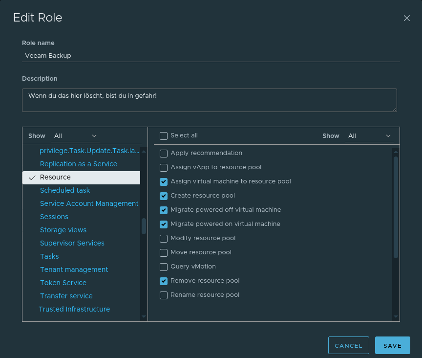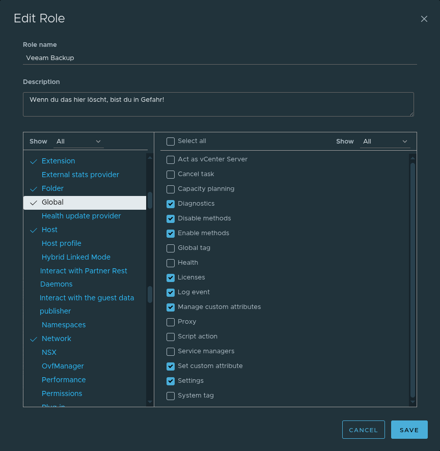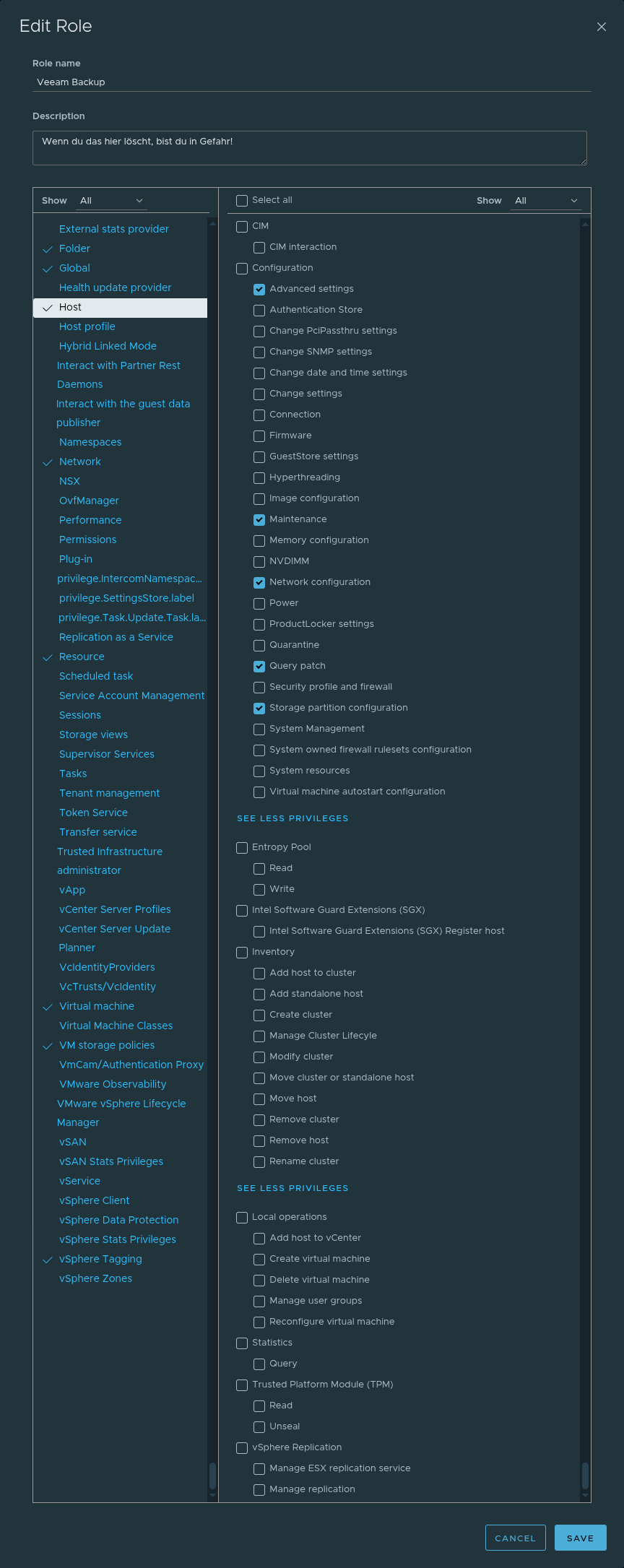 Wenn du zum Beispiel Veeam Backup and Replication für dein vCenter nutzt, kannst du es dir entweder einfach machen und dein administrator@vsphere.local Konto in Veeam hinterlegen oder du machst dir die Mühe und erstellst einen extra User und eine extra Sicherheitsrolle.